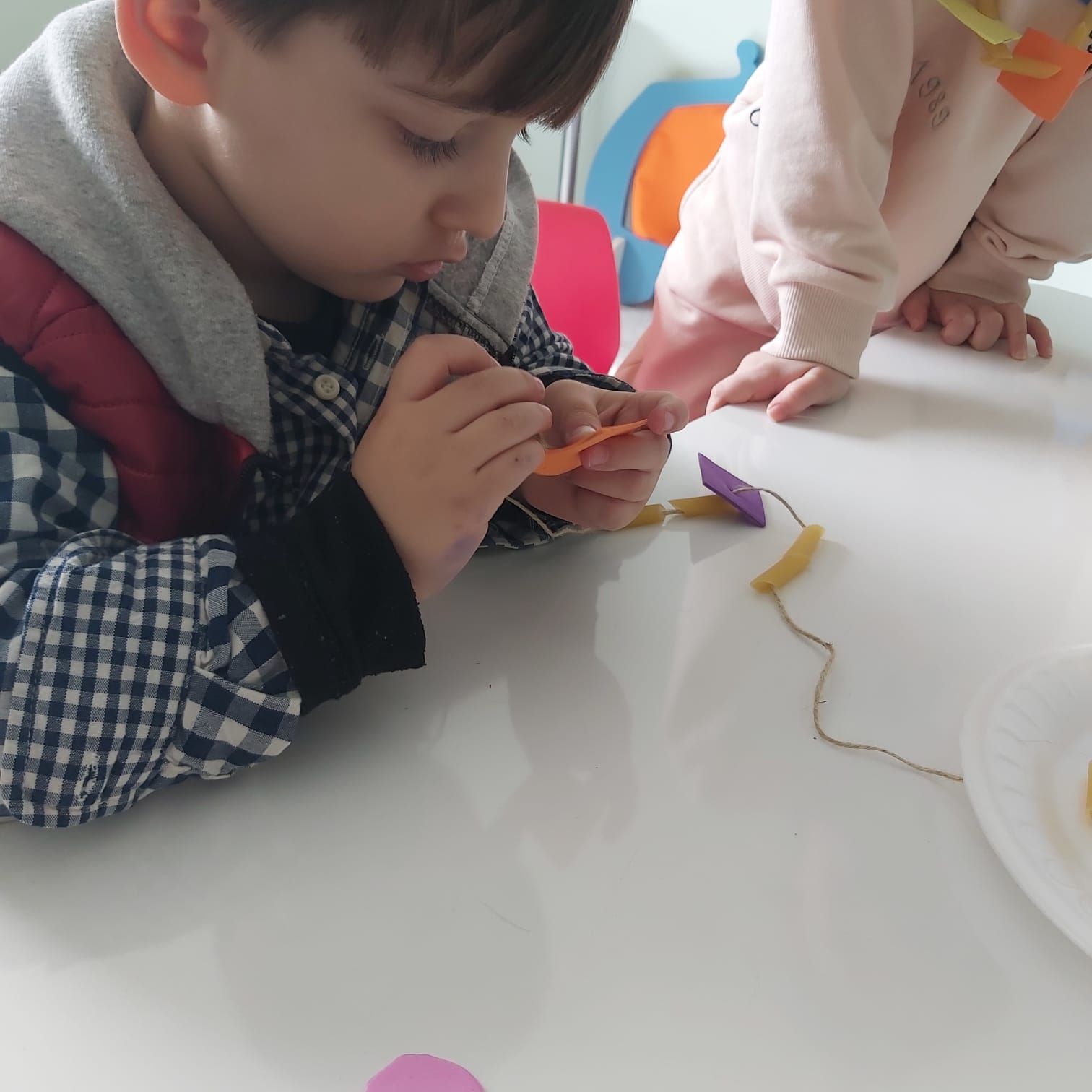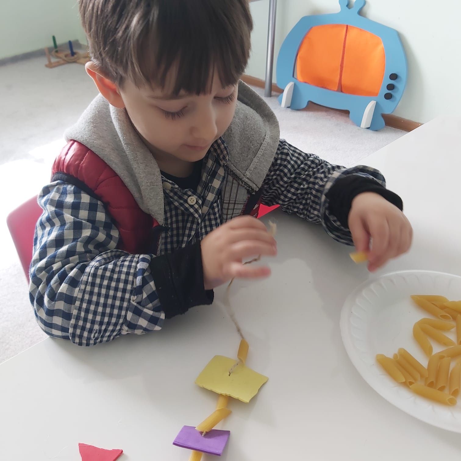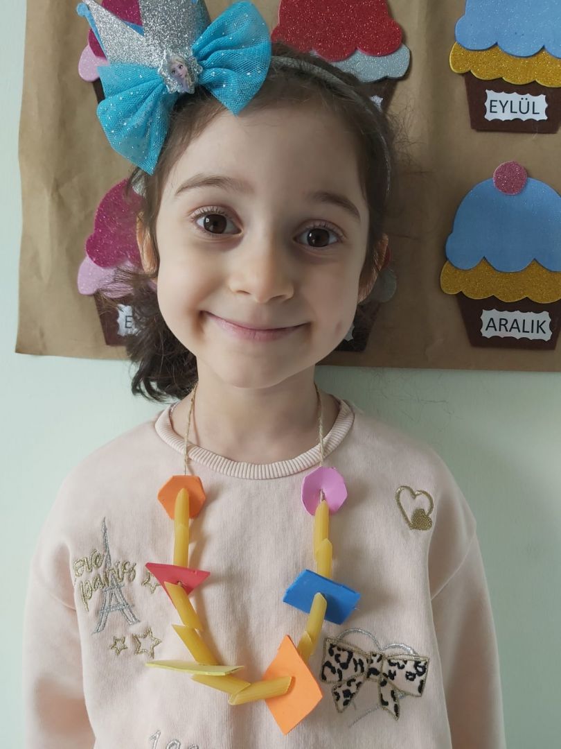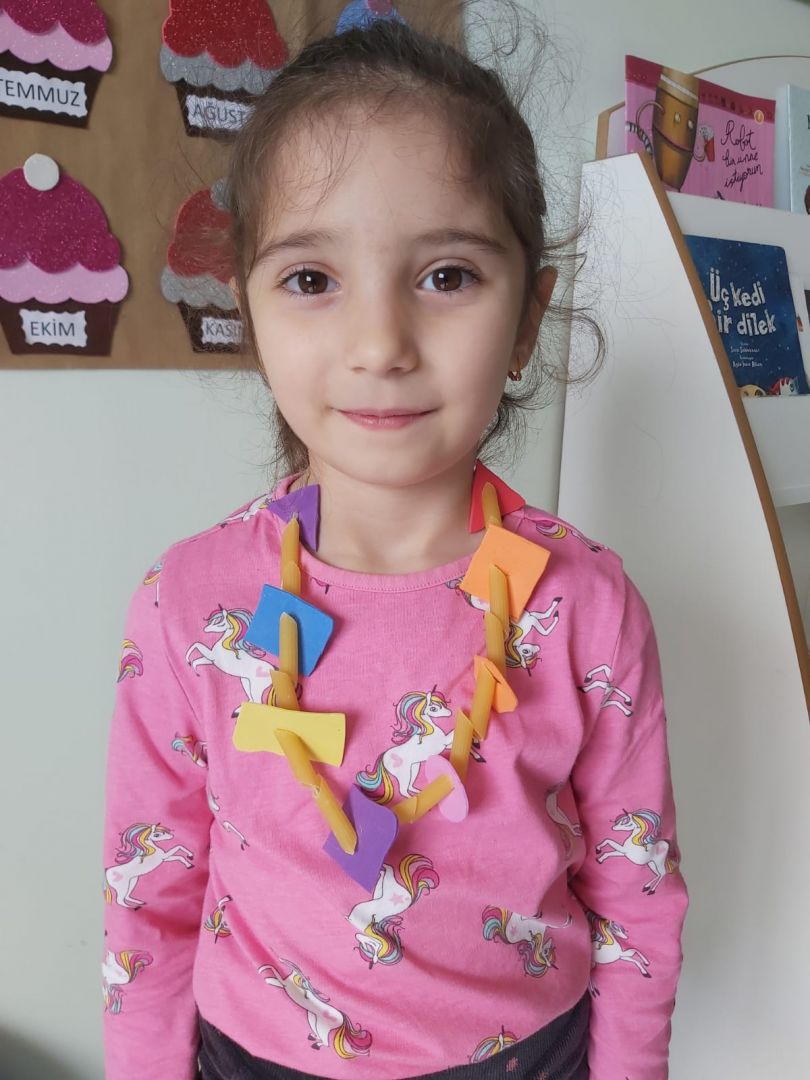 Eva ve makarna ile geometrik şekiller kolyesi yaptık
