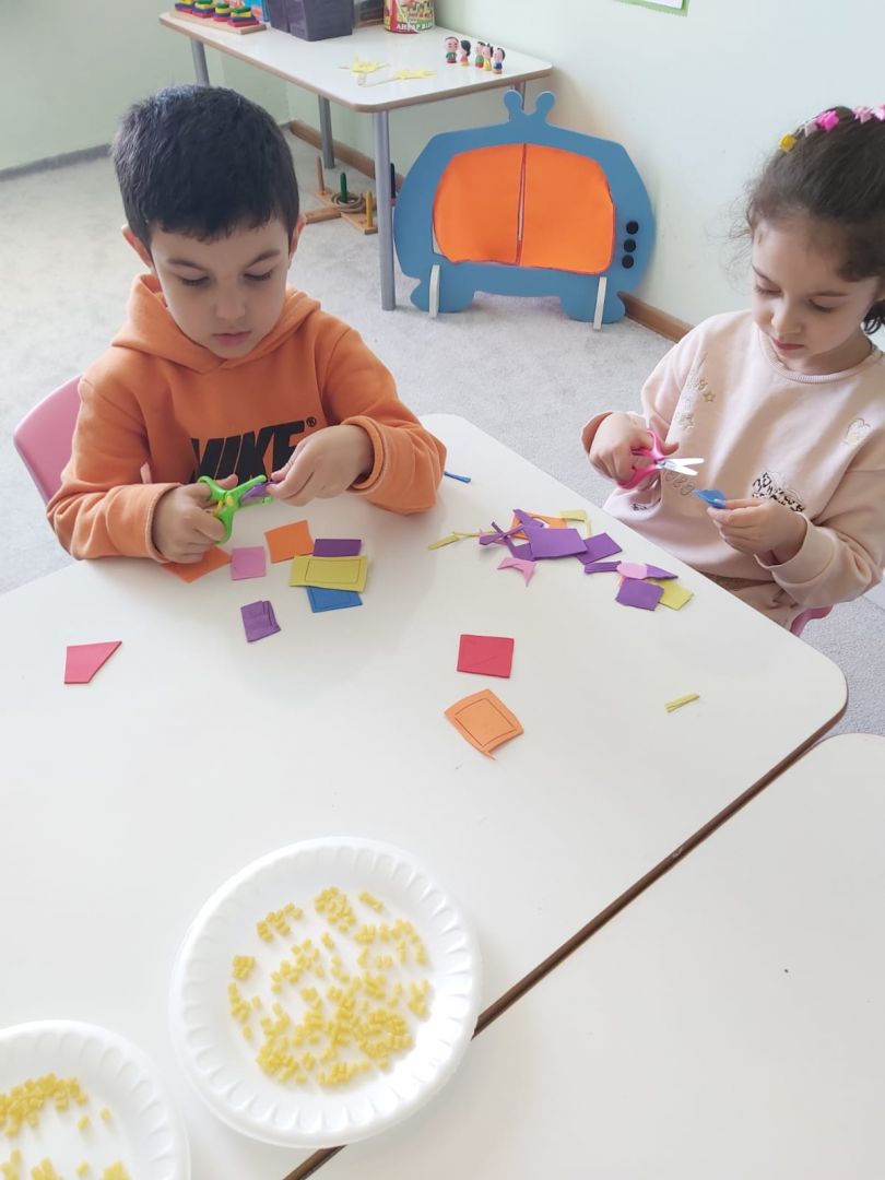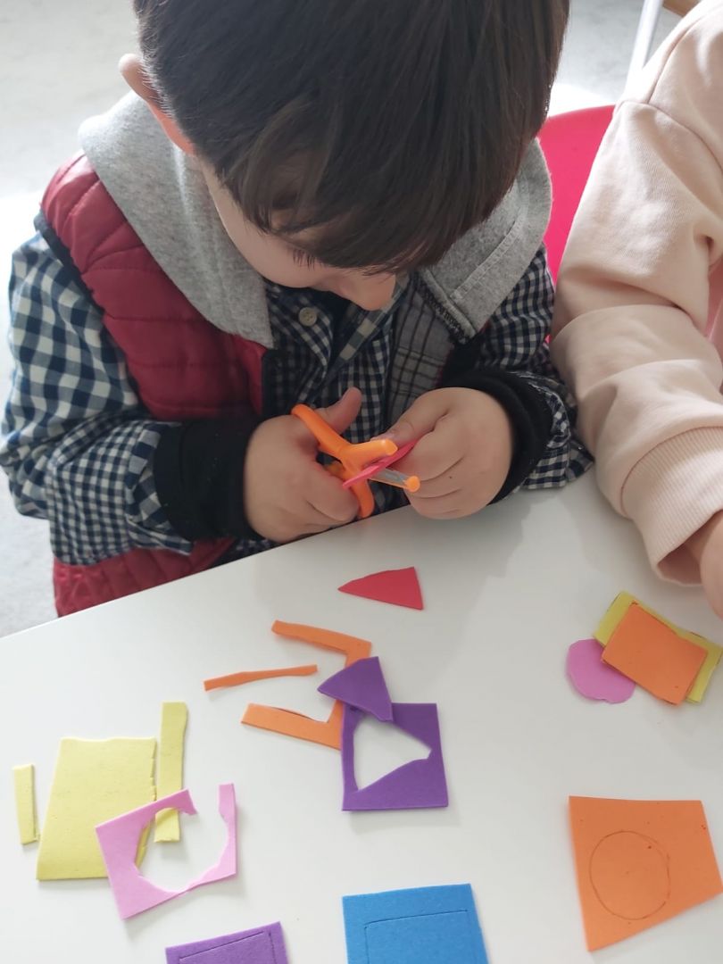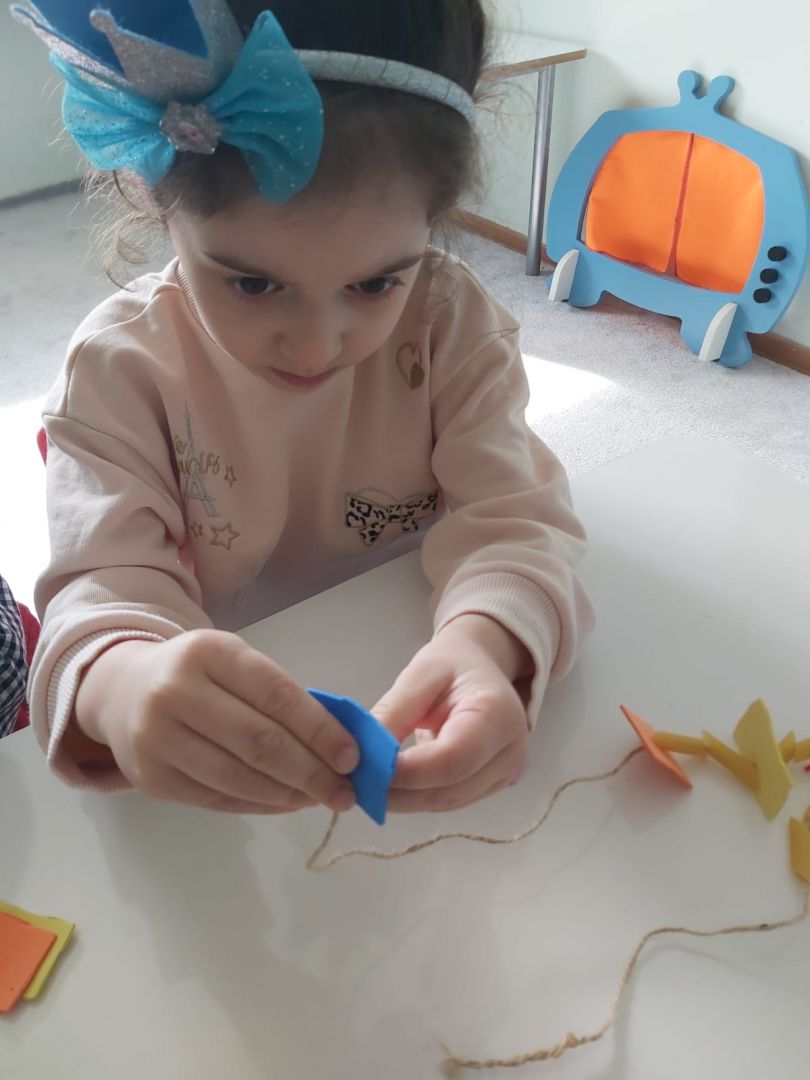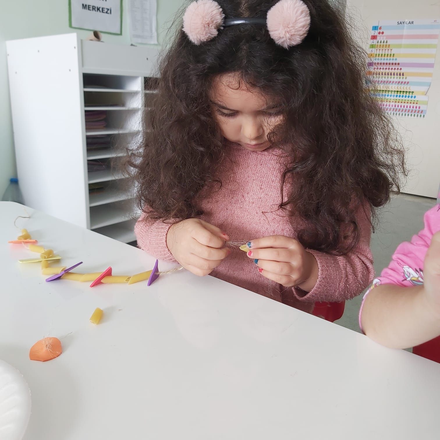Eva ve makarna ile geometrik şekiller kolyesi yaptık